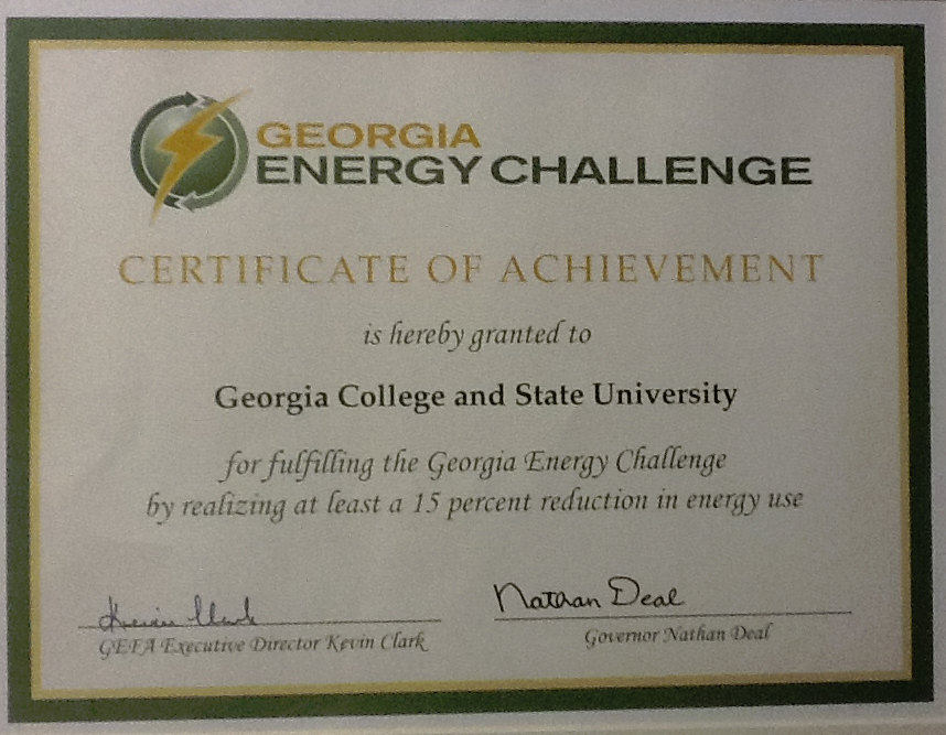 Congratulations to the GC Community for helping meet the Georgia Energy Challenge! The Georgia Energy Challenge was an initiative started by former Governor Nathan Deal in 2008 when all state agencies committed to reducing their energy usage by 15% by 2020. GC was one of 17 Georgia campuses recognized this past Friday, October 11, 2013, as having met this challenge. For more information on the Georgia Energy Challenge, visit http://www.georgiaenergychallenge.org/AboutUs.aspx.