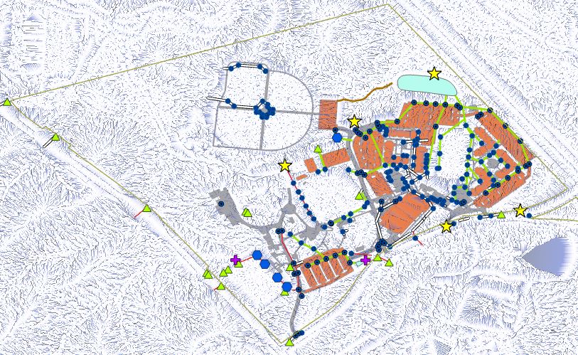 The detailed elevation data for West Campus was derived from the National Elevation Dataset, provided by the US Geological Survey. The high-resolution aerial imagery was captured by Cassidy and her geography professor, Dr. Mark Rochelo. They flew an unmanned aerial vehicle (UAV), commonly known as a drone, that collected a couple of hundred color photographs of the facility. Back in the GIS Teaching Lab, Cassidy and Dr. Rochelo ‘stitched’ the photos together using a virtual-3D rendering software called Pix4D to create very detailed images. Inside the GIS software (ESRI ArcGIS Pro), she extracted additional information about ditches, drains, and diversion canals. Cassidy spent a couple of wet afternoons walking around and watching the water run downhill to complete her field work!