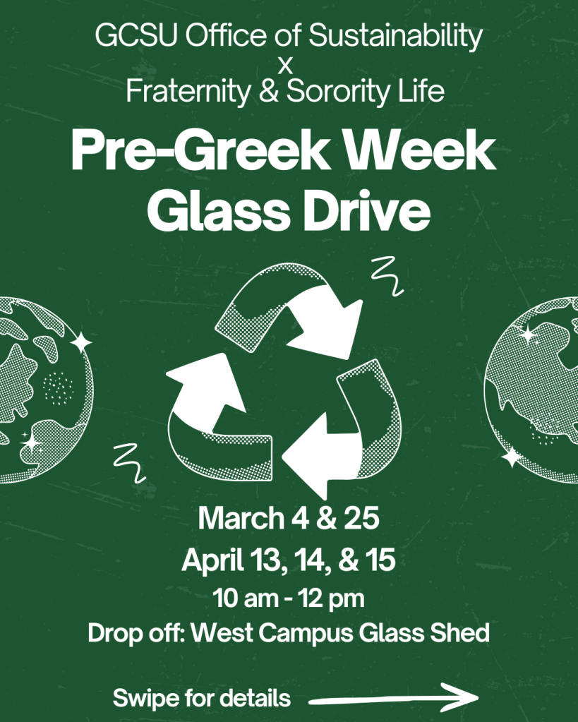 The Office of Sustainability, in partnership with the Office of Sorority & Fraternity Life at Georgia College & State University, is hosting a Glass Drive Competition for Greek-affiliated organizations. Participating organizations will compete to donate the most glass, with winners earning points toward Greek Week.