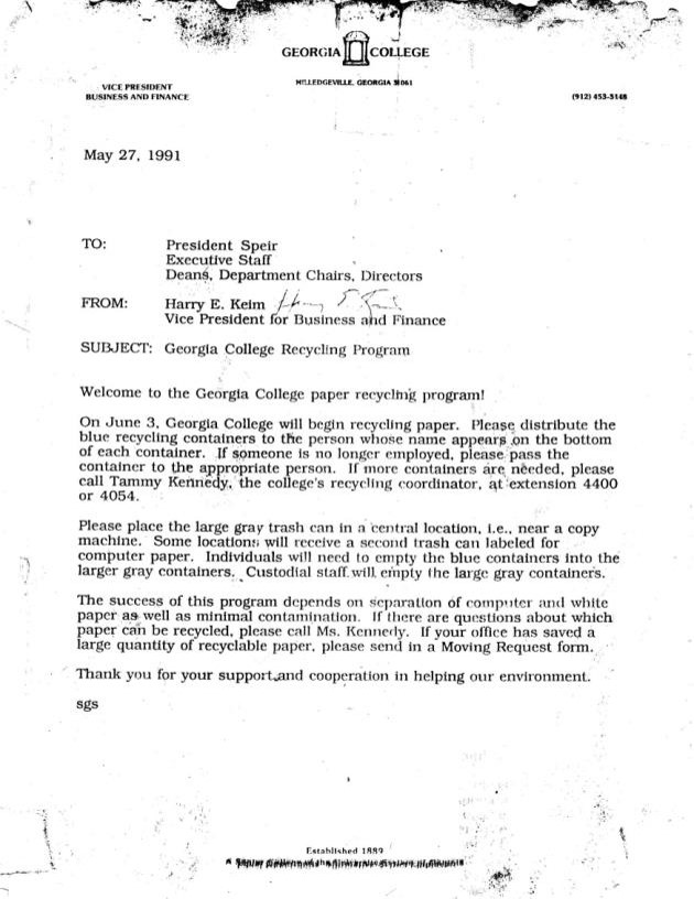 May 27, 1991 – GCSU Paper Recycling Program Correspondence to President Speir