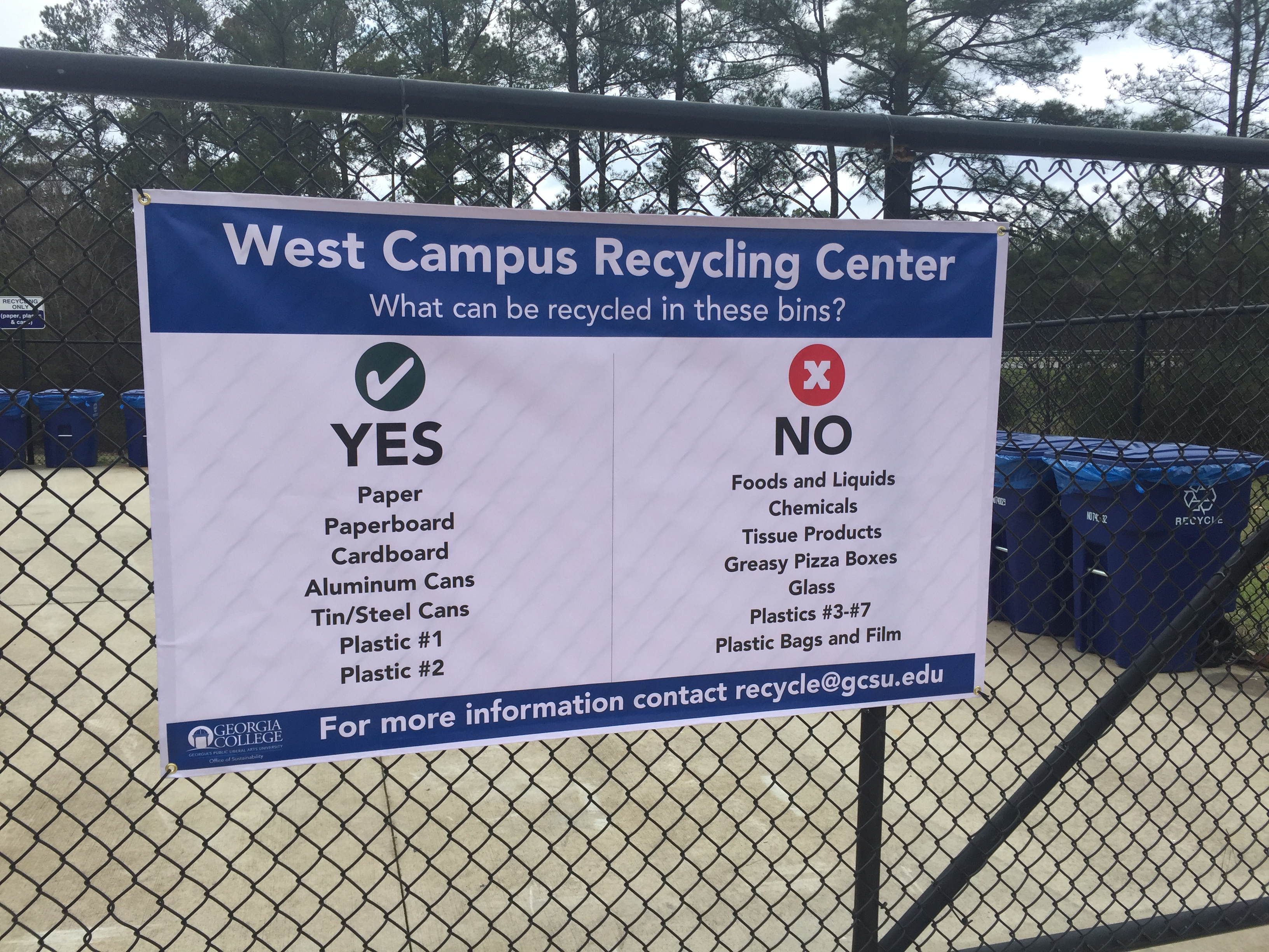 Dedicated Recycling Drop-off Facility at West CampusOn West Campus, there is a dedicated drop-off facility for use by Georgia College students. It is conveniently located near the Village apartments. All recyclable materials can be placed into the blue herby curbies located inside the fence. New signage is displayed at the West Campus Recycling Center informing students of the accepted recyclables.